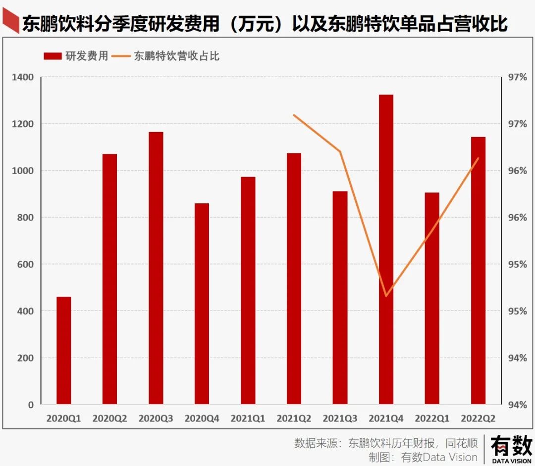 何况,从公司的角度来看,它似乎无意,也没有能力去打造新品:东鹏特饮大单品营收占比始终高达95%左右。公司研发费用长期在1000万左右波动。随着营收与净利润的上升,研发占比还有可能逐年下降。