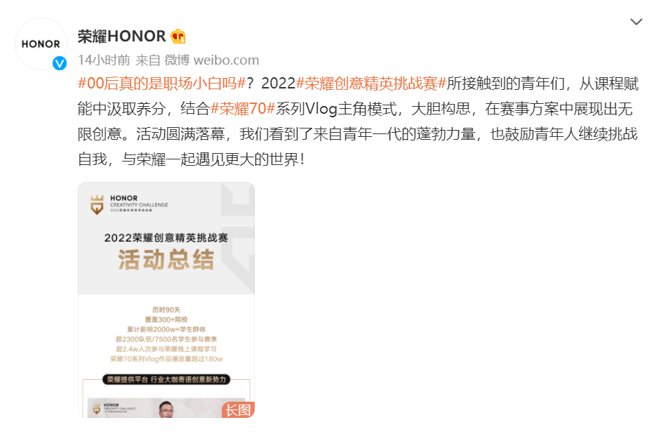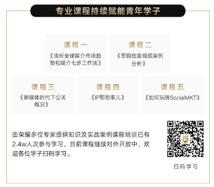 普惠青年学子,提供培训课程。区别于传统商业赛事的“竞赛”意味,2022荣耀创意精英挑战赛更希望成为青年学子的学习与赋能平台。在初赛阶段,荣耀为参赛者提供了由荣耀多位营销专家打造的实战案例培训课程,用先上课再比赛的方式,帮助年轻人打开创作思路,秀出创意能力。目前这些课程仍向所有人免费开放,已有超2.4万青年学子参与线上学习。