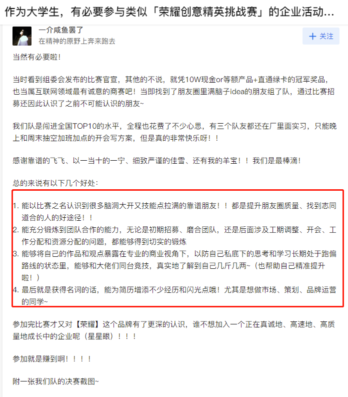 “培训赋能、特定赛题、营销实战、团队协作、方案输出......”依托强大的整合能力,2022荣耀创意精英挑战赛打通了教育链和人才链,以高校为入口为学子提供创意创新培训与实践触点,并基于自身的技术、产品和平台,全面赋能高校学生营销创意发挥,不仅为其提升未来职场竞争力,更为未来企业自身运营储备充沛的人才预备役。