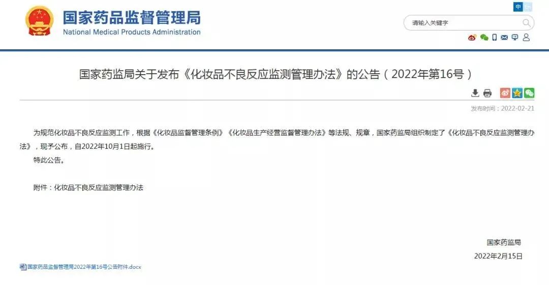 今年2月份,国家药监局发布了《化妆品不良反应监测管理办法》(以下简称“办法”),细化完善了关于化妆品不良反应监测的规定,进一步规范不良反应监测管理工作。该“办法”将于2022年10月1日起施行。