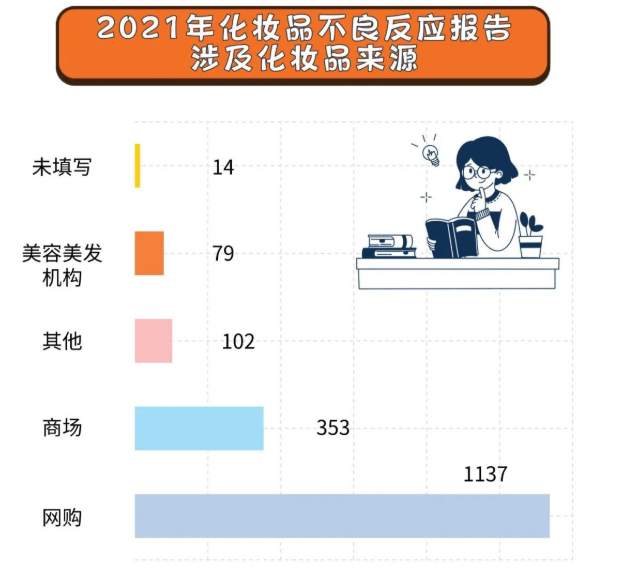 此前,湖北省药品监督管理局发布的《2021年湖北省化妆品不良反应监测年度报告》也显示,全省共收到8039份化妆品不良反应报告中,化妆品不良反应/事件报告的产品来源主要为网购、商场和美容美发机构。同2020年相比,网购化妆品引起的不良反应报告上升明显,增加了14.89%。