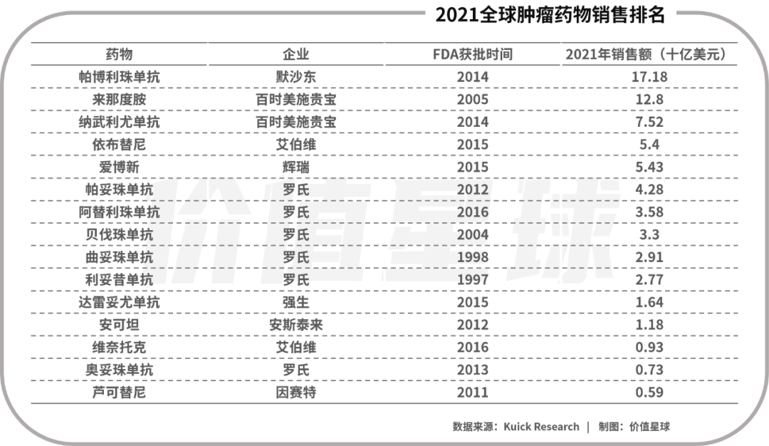 美国前总统卡特在2015年罹患恶性黑色素瘤,就是采用上述的K药进行治疗的,只用了半年多即告康复。彼时K药和O药上市不足一年,对黑色素瘤等的惊人疗效带火了PD-1药物。K药长年在全球最畅销的抗癌药物中排名第一,2021年为默沙东贡献了全年30%以上的营收,年销售额达到171.8亿美元。