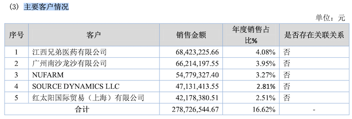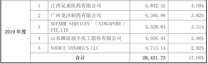 报告期,公司客户集中度并不高,来自前五大客户收入占当期营业收入的比例分别为17.00%、23.06%和20.90%。需要指出的是,山东潍坊润丰化工股份有限公司(下称:润丰股份)是绿霸股份2019年和2021年的第四大客户和第二大客户。