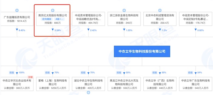 此外,济南信博还投资了爱格(上海)生物科技有限公司(下称:爱格生物),界面新闻记者从持有爱格生物70%的大股东——中农立华生物科技股份有限公司(下称:中农立华)的股权结构中,看到了ST红太阳(000525.SZ)的身影。