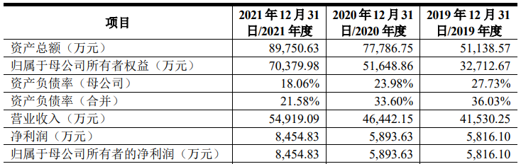 招股书显示,金凯(辽宁)生命科技股份有限公司主营业务为为全球原研药厂的新药研发项目提供小分子药物中间体以及少量原料药的定制研发生产服务。2019年、2020年、2021年,该公司实现营业收入分别是4.15亿元、4.64亿元、5.49亿元,同期实现归属于母公司股东的净利润分别是5816.1万元、5893.63万元、8454.83万元。其中,报告期内,CDMO业务收入占主营业务收入比例为94.56%、95.01%和95.72%,为公司收入和利润的主要来源。