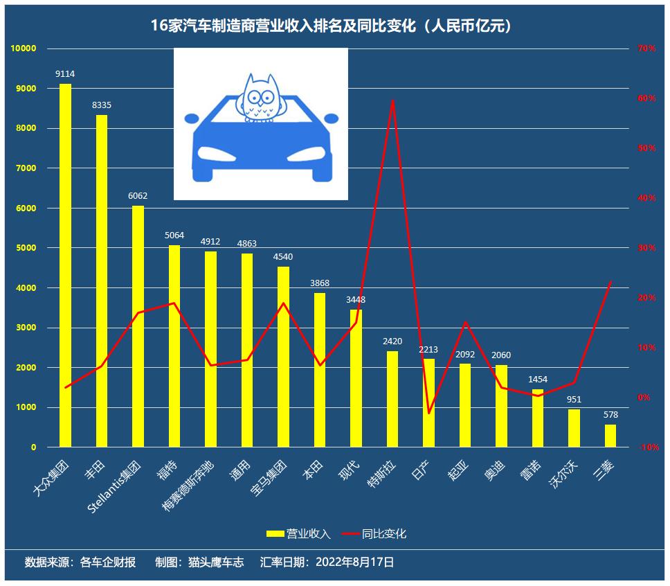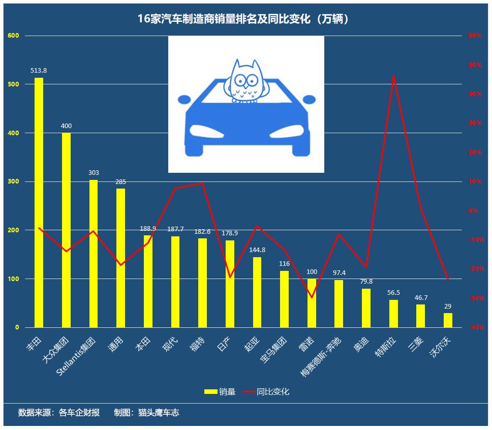 对此,猫头鹰车志根据全球各大主流车企发布的财报数据,按照当前汇率统一换算成人民币,整理出了销量、营业收入和净利润排行榜。