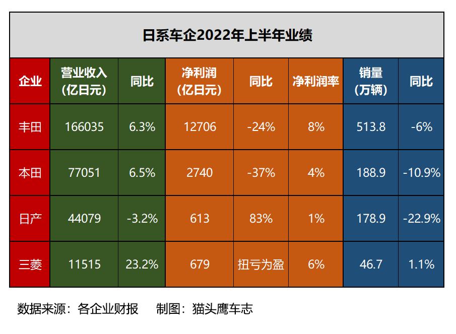 (注:由于日本车企采用的财报统计周期与其他企业不同,2022-2023财年的完整周期是2022年4月~2023年3月。为了更好地和其他企业业绩进行对比,猫头鹰车志将日系车企今年第一季度(1-3月)和第二季度(4-6月)的数据进行相加,统一表述为2022年上半年业绩。)