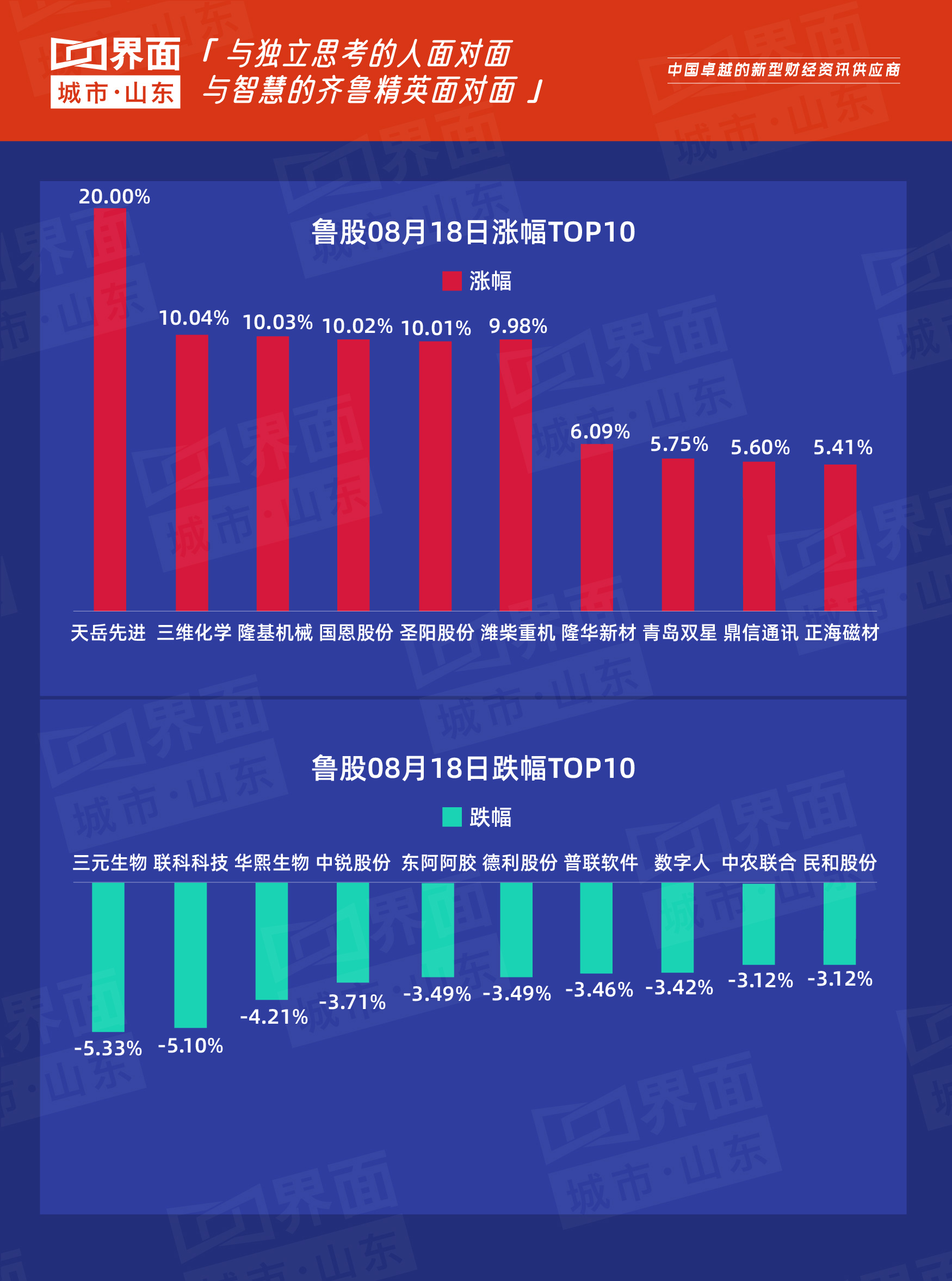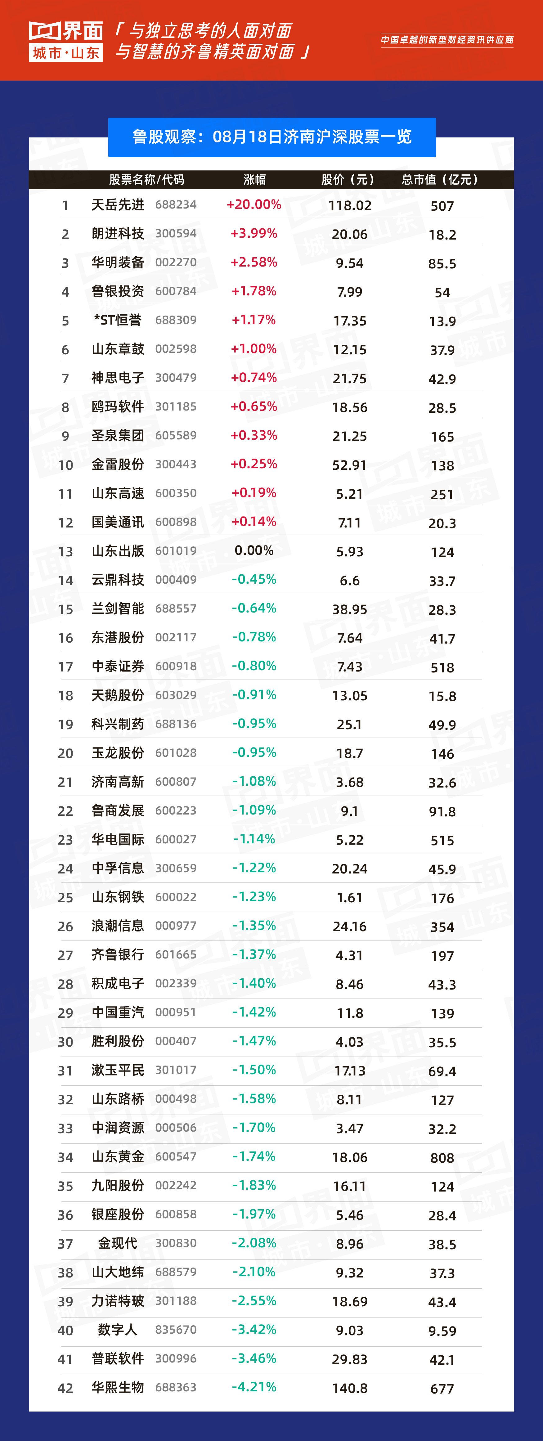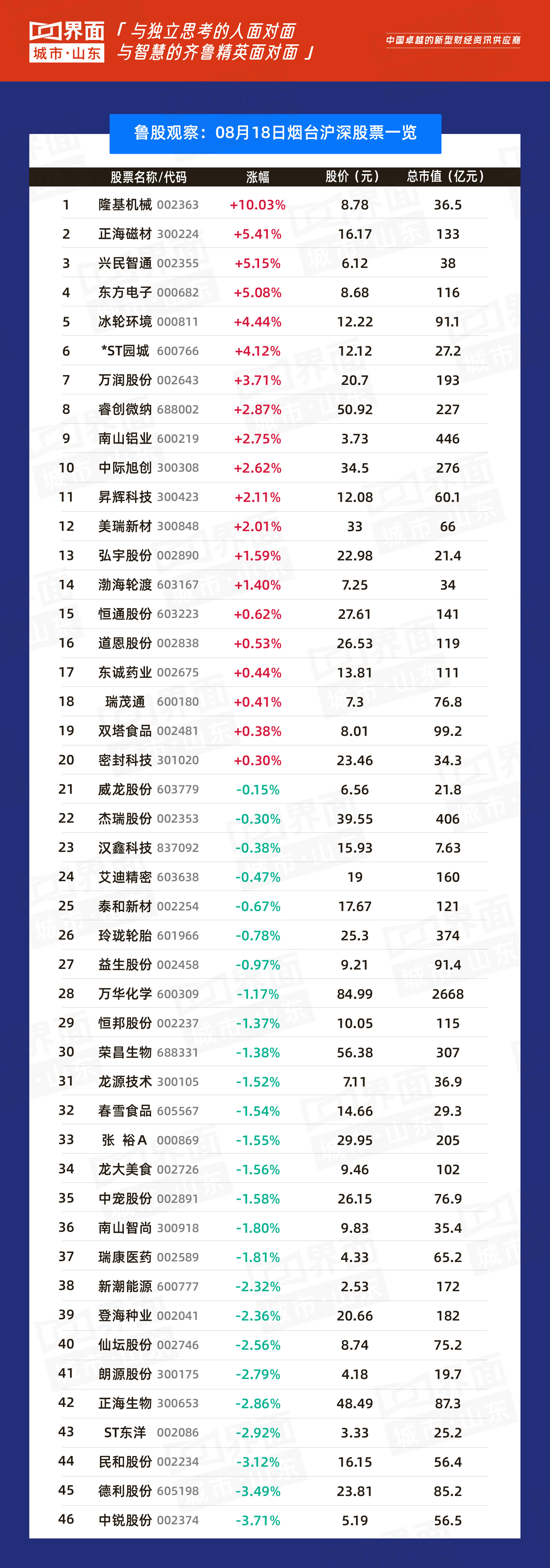 8月18日,山东省内沪深股票有104只个股上涨,167只个股下跌;总市值过千亿的有万华化学(600309)、海尔智家(600690)、兖州煤业(600188)、歌尔股份(002241)、青岛啤酒(600600)、中航沈飞(600760)、潍柴动力(000338)共7家,500亿-1000亿的共有7家,分别是山东黄金(600547)、华鲁恒升(600426)、华熙生物(688363)、联泓新科(003022)、中泰证券(600918)、华电国际(600027)、天岳先进(688234)。