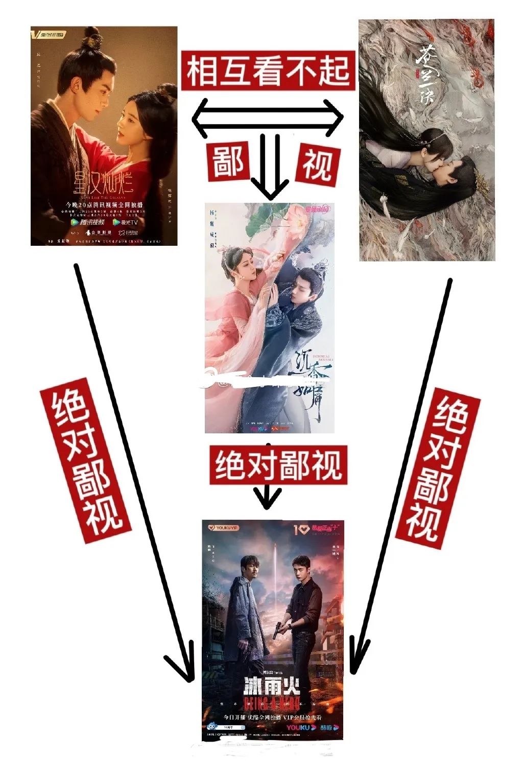 近日,#网友做的暑期新剧鄙视链图#这一词条在社交平台引发了热议。当前的鄙视链图有两个版本,1.0版本是《星汉灿烂》《沉香如屑》《苍兰诀》三者相互看不起,并一致绝对鄙视《冰雨火》;2.0版本与之的区别在于《星汉灿烂》《苍兰诀》在相互看不起间还在鄙视《沉香如屑》 。