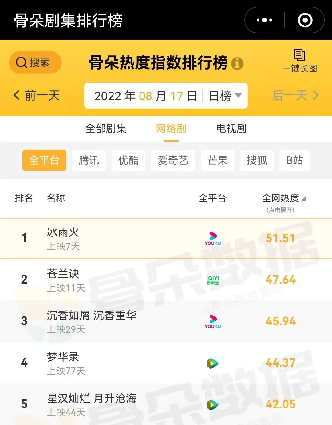 根据骨朵热度指数排行榜显示,《冰雨火》排行第一,《苍兰诀》《沉香如屑》《星汉灿烂》分别位列2、3、5位;微博开分方面,《冰雨火》开分8.6分,《星汉灿烂》《沉香如屑》《苍兰诀》微博开分分别是7.9、7.4、6.9;此外,《冰雨火》在年轻人群体间颇具影响力,根据艺恩数据显示,《冰雨火》24岁以下的受众占比7成以上,《星汉灿烂》《沉香如屑》《苍兰诀》24岁以下用户占比 80.82%、69.06%、62.12%。整体来说,无论是剧集热度、口碑还是在年轻用户的接受度上,《冰雨火》自身亦有相对的优势。
