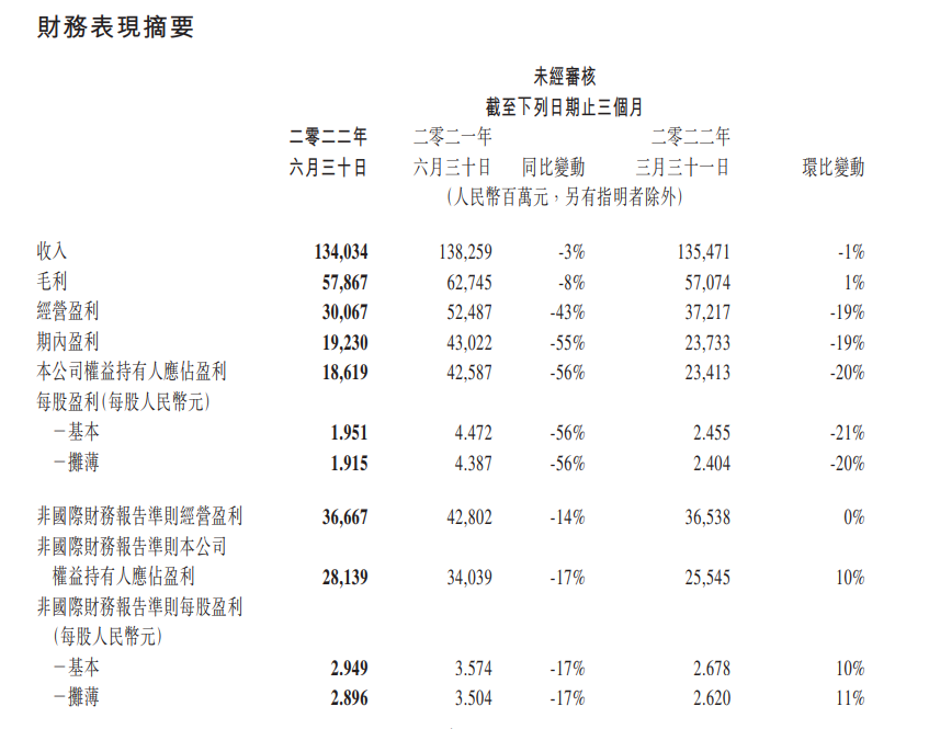 2022年4月至6月,腾讯营收1340亿元,同比下滑3.2%;净利润186亿元人民币,同比下降56%,低于市场预期的250.3亿元。
