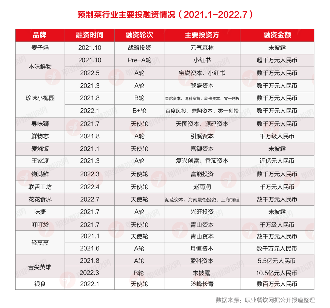 从去年开始,预制菜概念股经历过几次集体爆发。珍味小梅园、三餐有料、寻味狮、望家欢等预制菜上下游各企业前后都在2021年获得融资,IDG资本、美团龙珠、百度风投等资本都在预制菜赛道上押注。