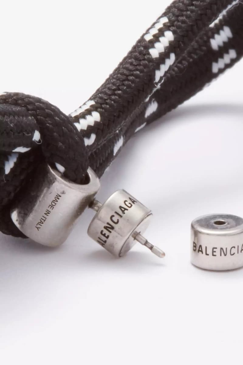 这是巴黎世家2022秋季推出的新品,名为“Plate Bow”,黄铜耳钉的部分还刻有“Balenciaga”和“意大利制造”的字样。与之同期上市的还有巴黎世家老爹鞋鞋带制成的手环,定价也是1900元。
