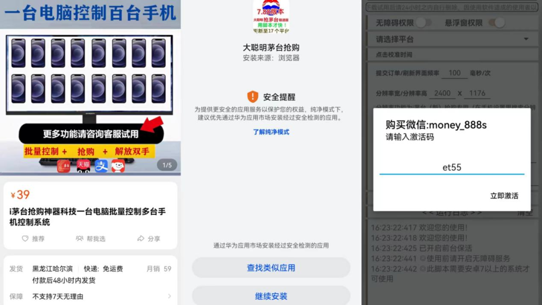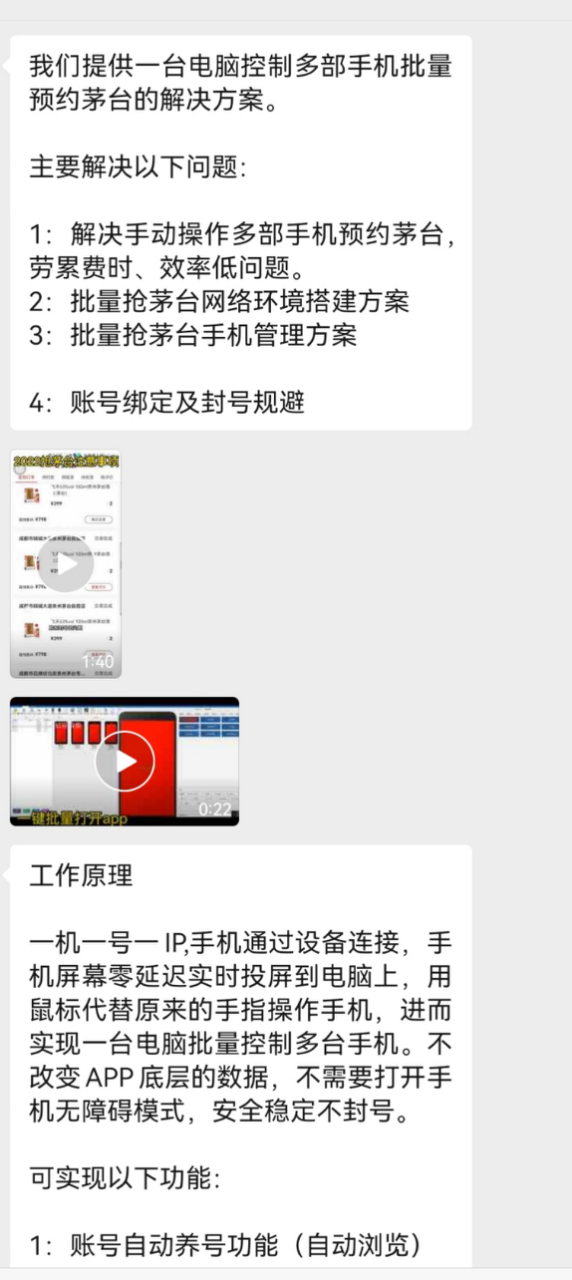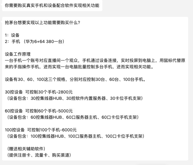 刷新界面只是低端操作,据介绍,用户可以购买一台手机和相关设备,实现批量抢购,声称帮你解决“手动操作多部手机预约茅台,劳累费时、效率低等”问题,帮助实现“批量抢茅台网络环境搭建方案等”。一部手机380元,30控设备(可控制30个手机)为2800元,60控设备5000元,60控设备6000元。