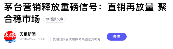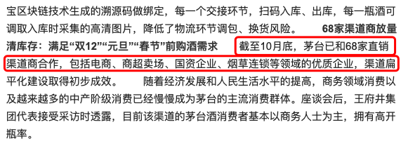但在此条澄清公告之前,2020年11月20日,茅台集团在公众号上发文《茅台营销释放重磅信号:直销再放量 聚合稳市场》,文中提及,截至10月底,茅台已和68家直销渠道商合作,包括电商、商超卖场、国资企业、烟草连锁等。目前该文章已被删除。