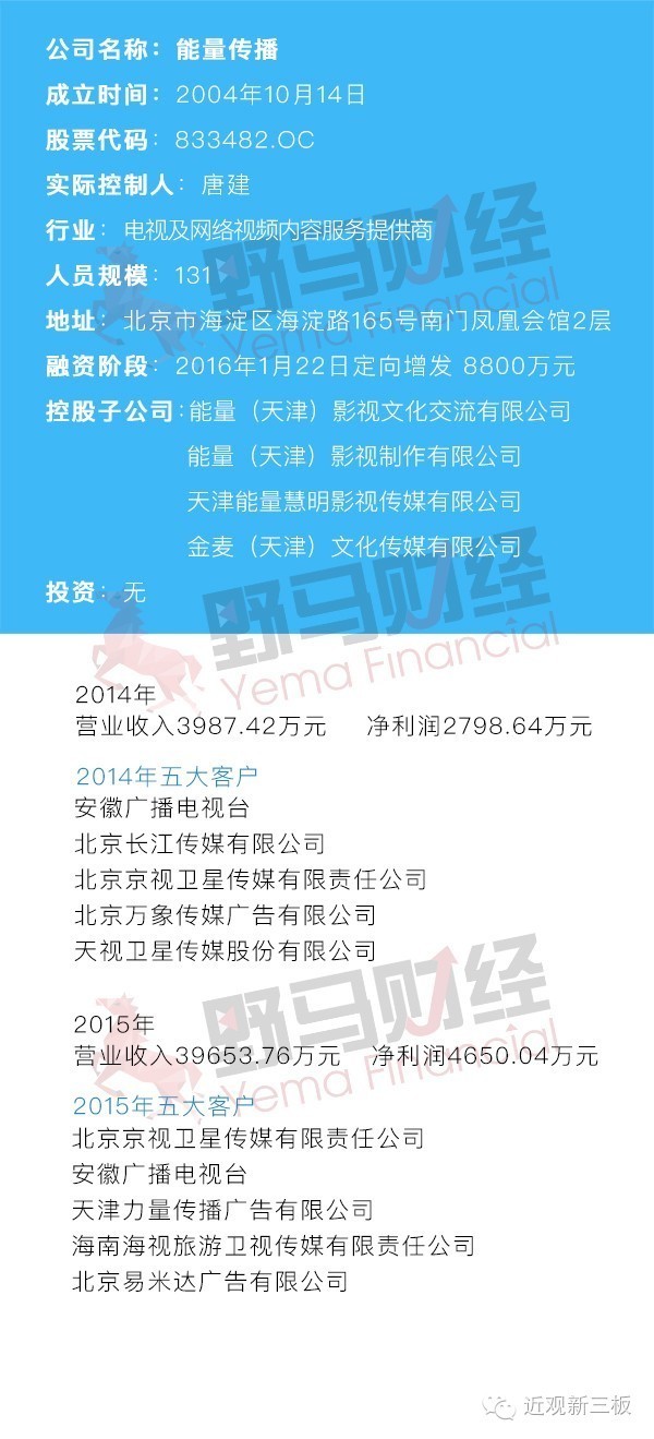 能量传播(833482.OC)全名为北京能量影视传播股份有限公司,2015年9月1日登陆新三板,于2016年1月29日正式从协议转让转变为做市转让,且在分层制度落地后成功进入创新层。