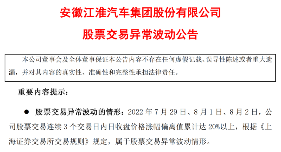 8月3日,江淮汽车公告称,公司在2022年的7月29日、8月1日和8月2日,股票交易连续3个交易日累计涨幅超20%。按照上交所的规定,属于异常波动情形。对此,江淮汽车在对自身企业进行自查后表示,公司生产经营情况正常,并没有什么影响股价波动的异常情况。