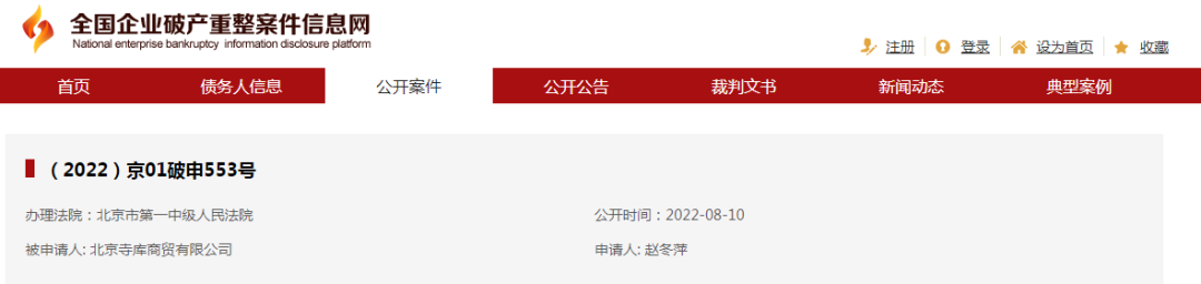 8月10日,全国企业破产重整案件信息网显示,北京寺库商贸有限公司被申请破产审查,申请人为赵冬萍。这已是该公司今年内第二次被申请破产审查。2022年1月,寺库也曾被申请破产审查,不过当时寺库否认申请破产,次日申请人撤回了申请。《中国企业家》就破产消息询问寺库,截至发稿前未获得回复。