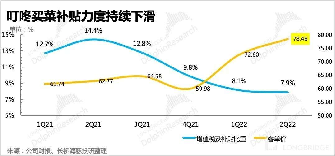 长桥海豚投研的数据也显示,叮咚买菜的补贴力度自去年同期之后就一直在下滑。