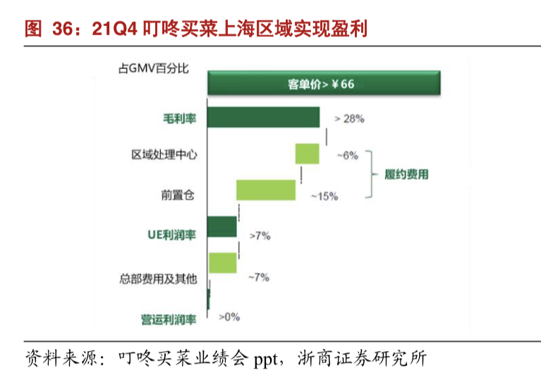 根据2021年单均口径数据拆分,叮咚买菜单均毛利为9.9元(毛利率19%),单均履约费用为18.8元(履约费用率37%),UE层面单均亏损8.9元。