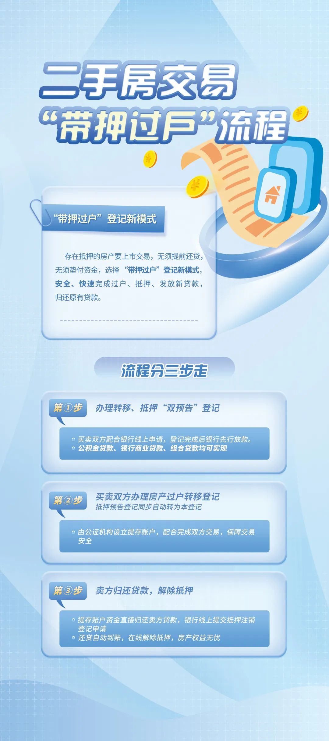 全面化解了交易风险。传统模式下,买方银行是先审批,后过户登记后才放款,在这个过程中,买方在征信及贷款登记资料的准备上难免会出现什么问题,一旦无法办理抵押登记,买方就要通过其他方式来筹措大量资金支付给卖方。同时,因为房子是先完成过户的,在这个过程中,卖方承担的风险是巨大的,有可能房财两空。过去经常有这样的案例,买卖双方都承担着很大的压力,有些交易也会因为存在这样的风险而取消。还有种情况 ,就是在传统流程下,环节多而且时间长,在这个过程中,一旦买卖双方任何一方出现经济纠纷,法院查封房子,对整个交易会产生不利的影响。而新模式是不需要先解押,买方把房款打到提存账户就可以拿到房,如果过户存在问题,房款还能原路返还,最大程度保障双方利益,将风险降至最低。
