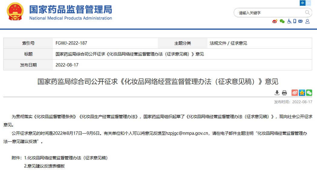 8月17日,国家药监局官网发布了《化妆品网络经营监督管理办法(征求意见稿)》(以下简称“征求意见稿”),现向社会公开征求意见。