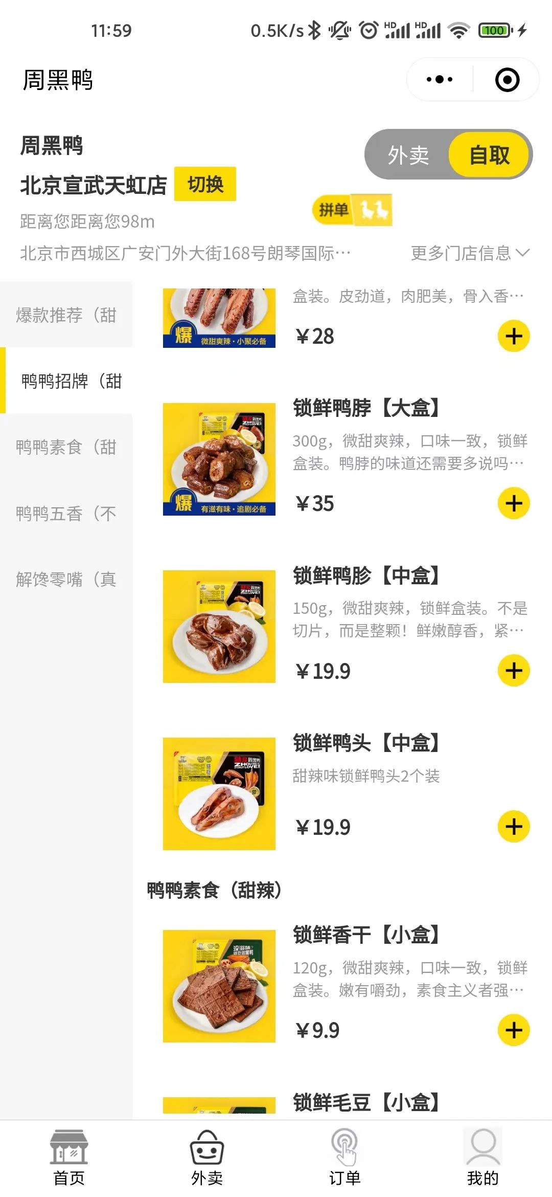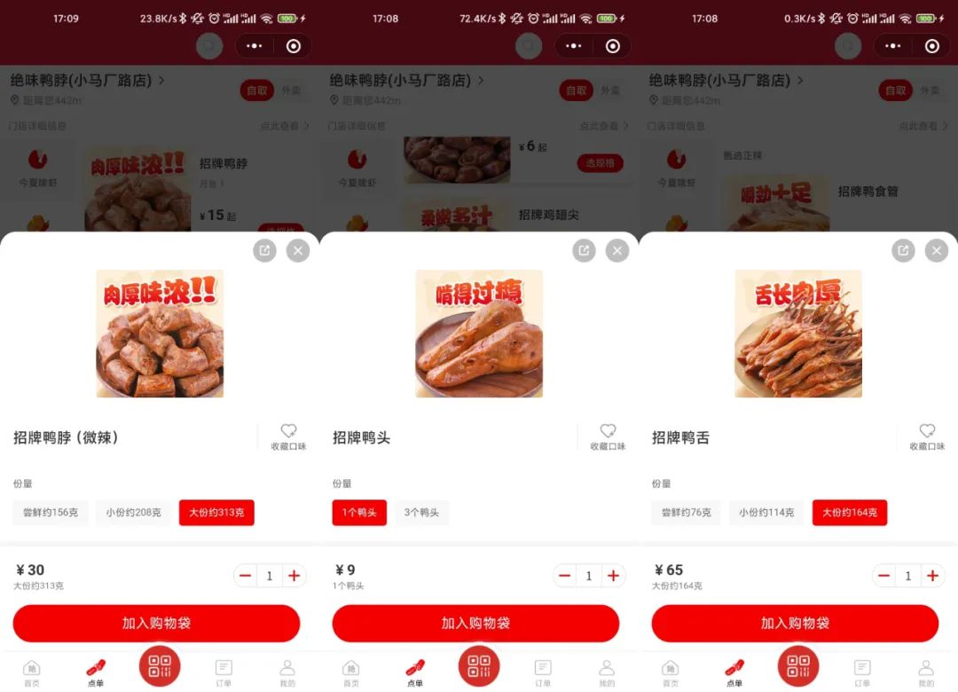 在绝味鸭脖的小程序上点单,一份313克的鸭脖,售价30元;一个鸭头,售价9元;鸭舌更是夸张,164克售价65元。