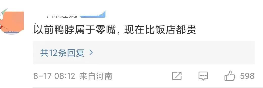 网友对此的解释是:鸭脖越来越贵,年轻人却越来越没钱。