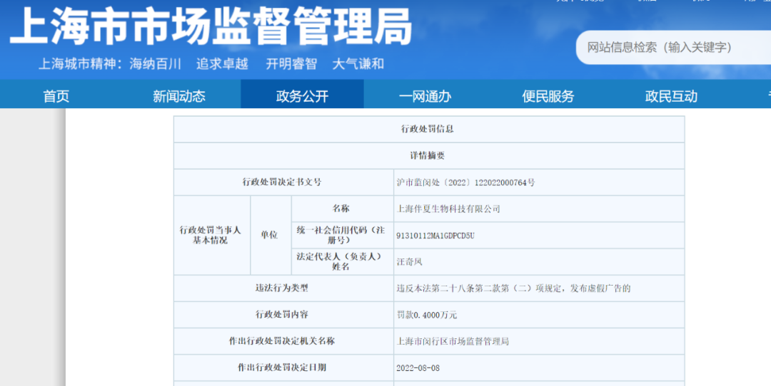 基于此,闵行区市监局认为,伴夏生物上述行构成了发布虚假广告的行为,最终作出如下处罚决定:责令当事人停止发布广告、在相应范围内消除影响,并罚款4000元。