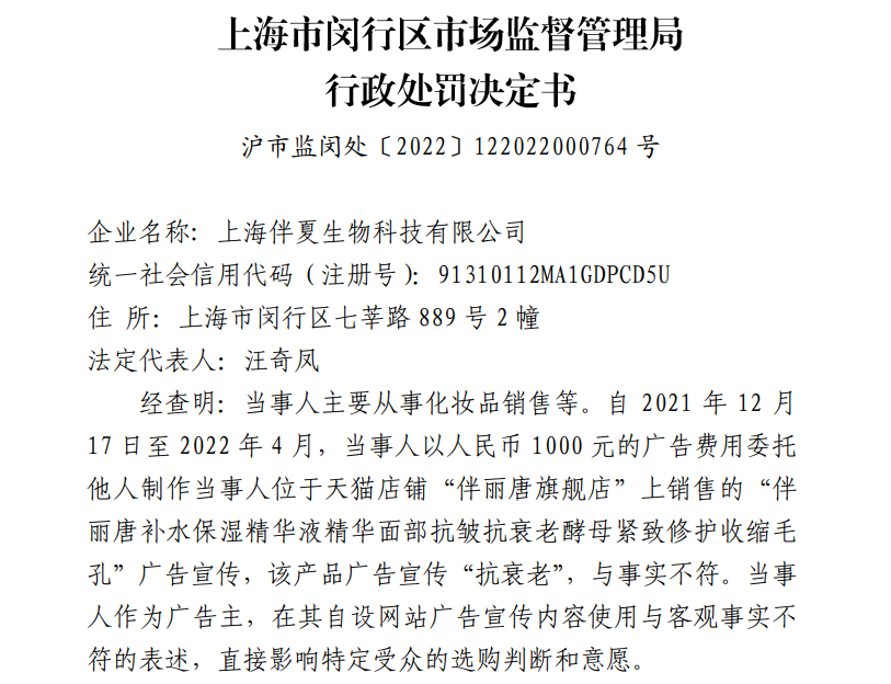 据披露,上海伴夏生物科技有限公司(以下简称“伴夏生物”)因在其天猫旗舰店内,对外销售的商品广告宣传中含有“抗衰老”等字眼,构成虚假广告的行为,被罚款4000元。