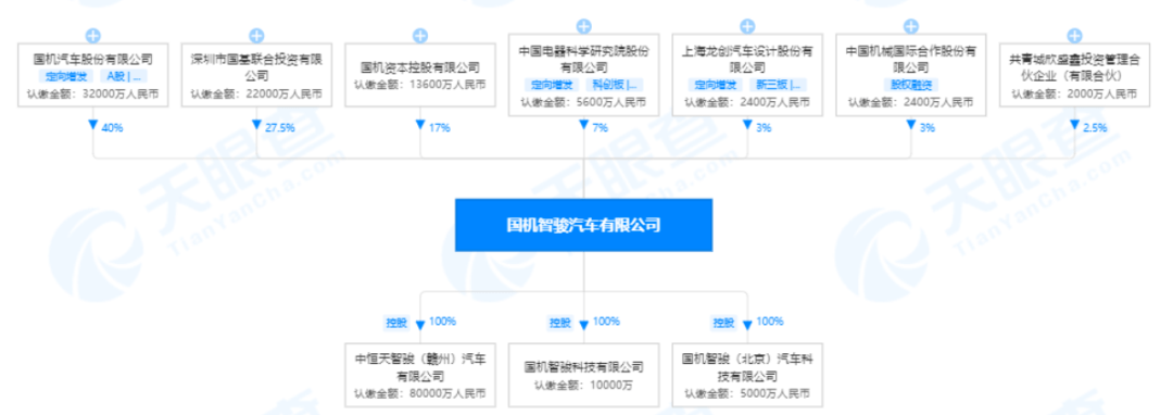 天眼查显示,国机汽车对国机智骏持股40%,为最大股东,深圳市国基联合投资有限公司和国机资本控股有限公司分别持股27.5%和17%。