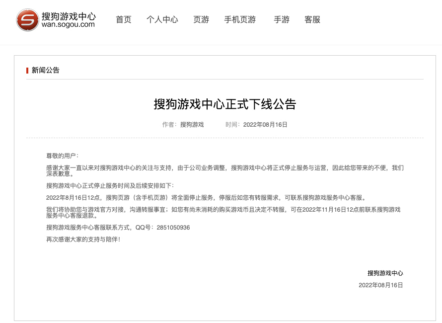 搜狗游戏中心官网8月16日发布公告称,由于公司业务调整,搜狗游戏中心将正式停止服务与运营。2022年8月16日12点,搜狗页游(含手机页游)将全面停止服务。公司将协助用户与游戏官方对接,沟通转服事宜;如客户有尚未消耗的购买游戏币且决定不转服,可在2022年11月16日12点前联系搜狗游戏服务中心客服退款。