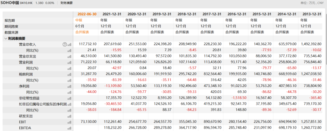 事实上,一直以来,SOHO中国的营收构成包括租金收入和出售物业单位两部分。但从2021年至今,出售物业收入却一直为0,而2020年这一数据约为6.54亿元。