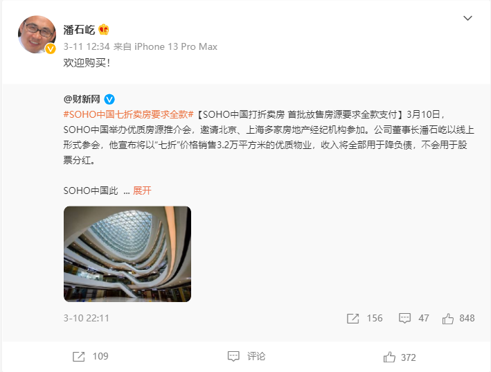 当然,已经习惯“卖卖卖”的潘石屹并没有打算放弃这部分收入。SOHO中国表示,为减轻资金压力及改善财务状况,未来会继续采取措施出售部分商业物业尾盘。