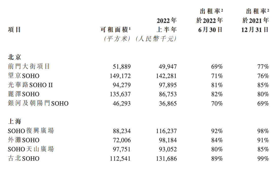 不过,受新冠疫情影响,北京及上海办公楼租赁市场承压。截至2022年6月30日,SOHO中国投资物业平均出租率下降至约80%。