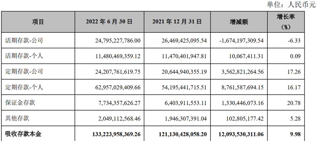 利息收入表现却与贷款和垫款余额表现相反,2022年上半年该行个人贷款和垫款利息收入同比增长15.71%,而公司贷款和垫款同比增长为11.01%。说明个人业务未来仍很有潜力,从存款情况也可略看出一二。