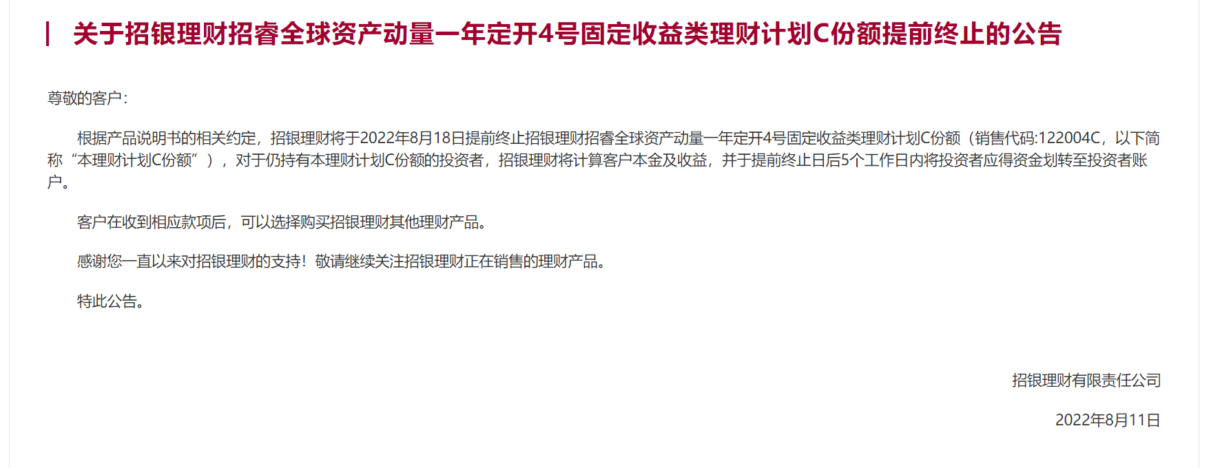 8月11日,招银理财公告称,于8月18日提前终止招银理财招睿全球资产动量一年定开4号固定收益类理财计划C份额,对于仍持有该理财计划C份额的投资者,招银理财将计算客户本金及收益,并于提前终止日后5个工作日内将投资者应得资金划转至投资者账户。