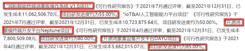 上半年鸿蒙相关业务未有规模性盈利其实是有迹可循的。2021年年报中,润和软件表示“润和智能终端鸿蒙版操作系统 V1.0项目”、 “开源鸿蒙瘦终端开发平台Neptune项目”和“开源鸿蒙富设备开发平台DAYU项目”均处于研发过程中,研发进度分别为55%、80%、85%。项目研发未完工,营收“含鸿”量低也成必然。