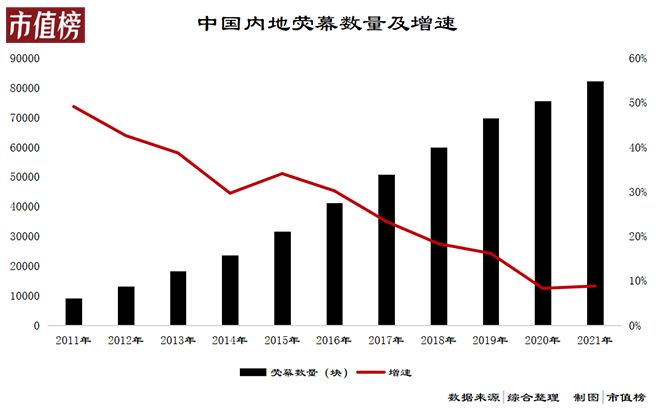 从2018年开始,中国内地荧幕数量的增速低于20%,2020年和2021年均低于9%。和2011年相比,2019年每块荧幕产生的票房下降了三分之一,边际收益越来越低,渗透率的提升也将越来越缓慢。