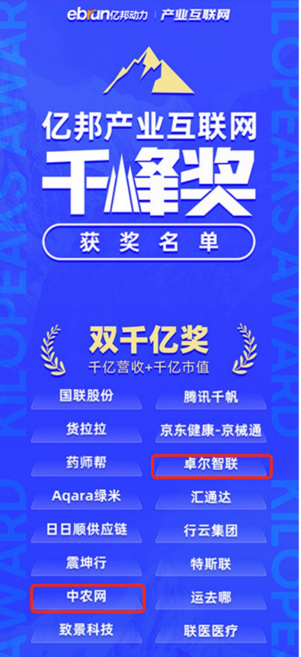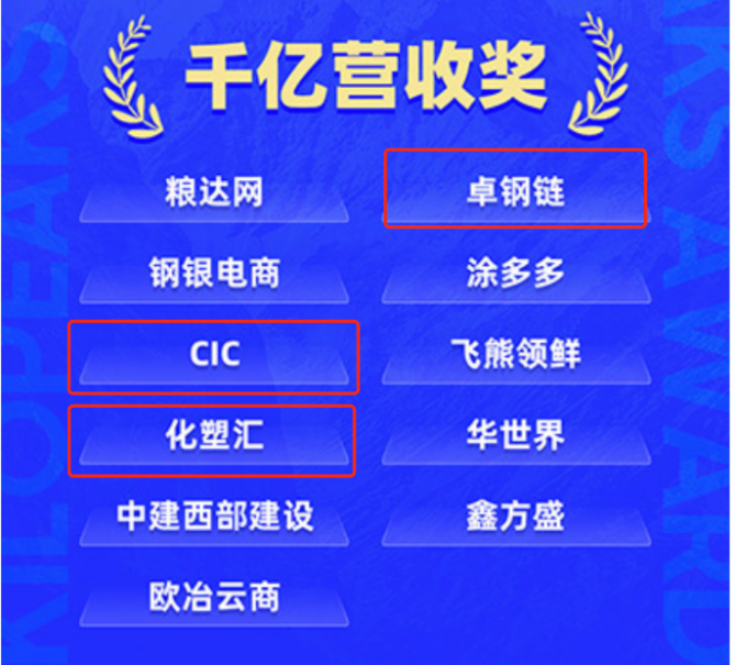 19日晚,千峰奖获奖企业名单隆重揭晓!卓尔智联及旗下中农网斩获了双千亿大奖,此外,卓尔智联旗下平台卓钢链、化塑汇、CIC荣获千亿营收奖。