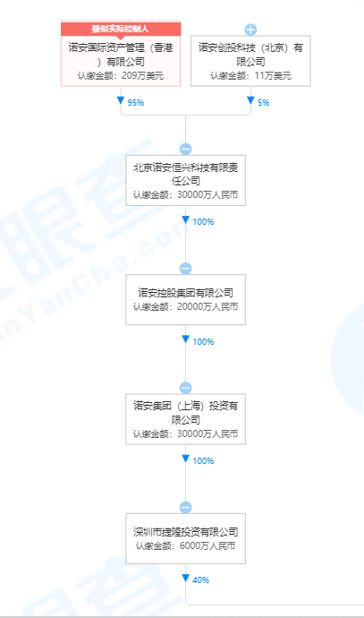 其中,股权穿透来看,深圳市捷隆投资有限公司为诺安集团(上海)投资有限公司的全资子公司,而后者则是诺安控股集团有限公司的全资子公司。诺安控股集团又是北京诺安恒兴科技有限责任公司的全资子公司。最终,诺安国际资产管理(香港)有限公司则持有北京诺安恒兴科技95%的股权,为疑似实际控制人。诺安创投科技(北京)有限公司则持有北京诺安恒兴科技5%的股权。