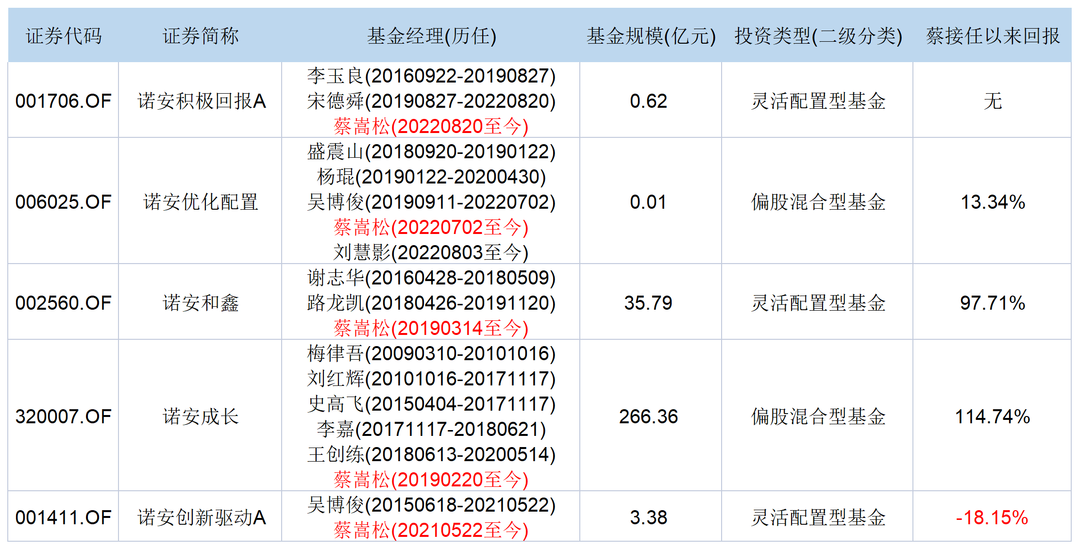 自2019年2月20日管理诺安成长“一战成名”后,蔡嵩松先后接管了诺安和鑫、诺安创新驱动、诺安优化配置、诺安积极回报4只基金。