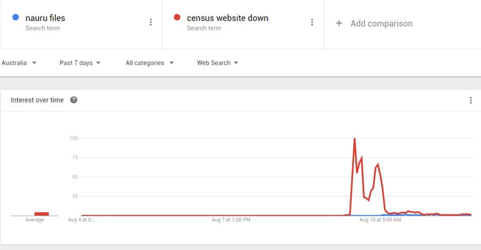 根据Google趋势的统计,与同时发生在9日的澳大利亚统计局官网被黑事件相比,搜索瑙鲁文件的澳大利亚网友少得可怜。