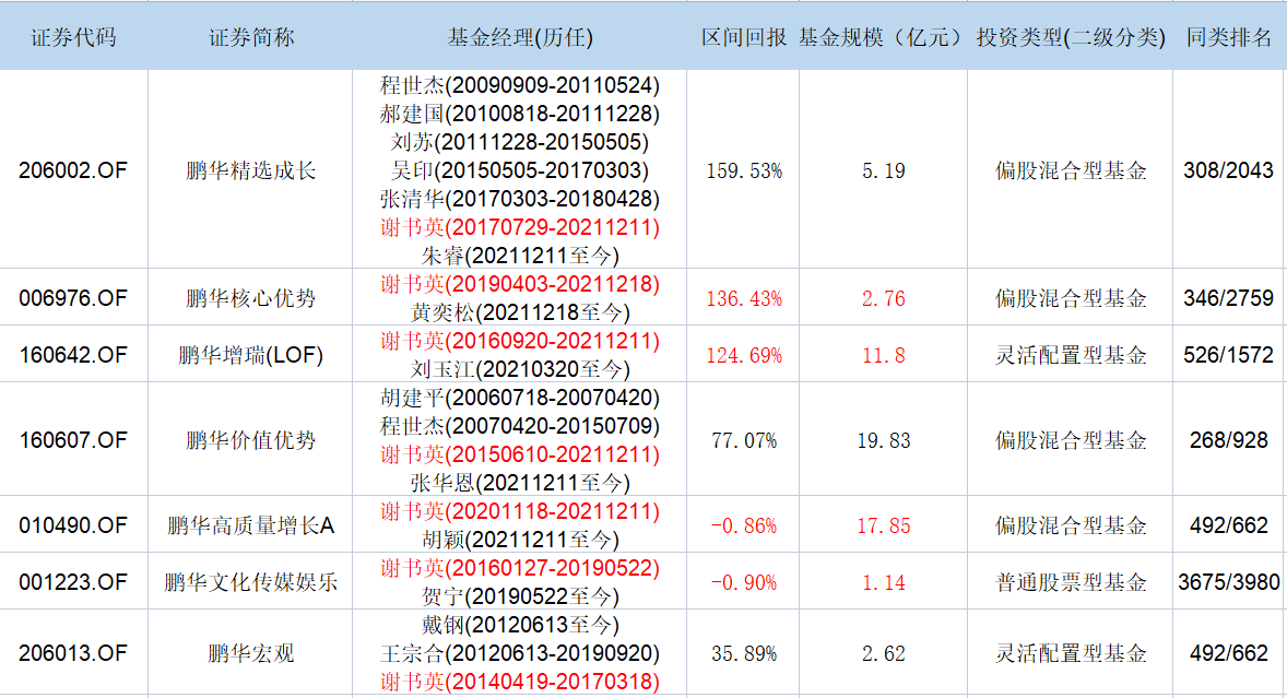 谢书英在鹏华基金共管理鹏华价值优势、鹏华精选成长、鹏华核心优势等7只产品,虽然业绩不错,但规模均较小。以其管理时间最长的鹏华价值优势混合为例,在2015年6月10日至2021年12月11日任职期间,回报率为77.07%,wind数据显示同类排名为268/928。