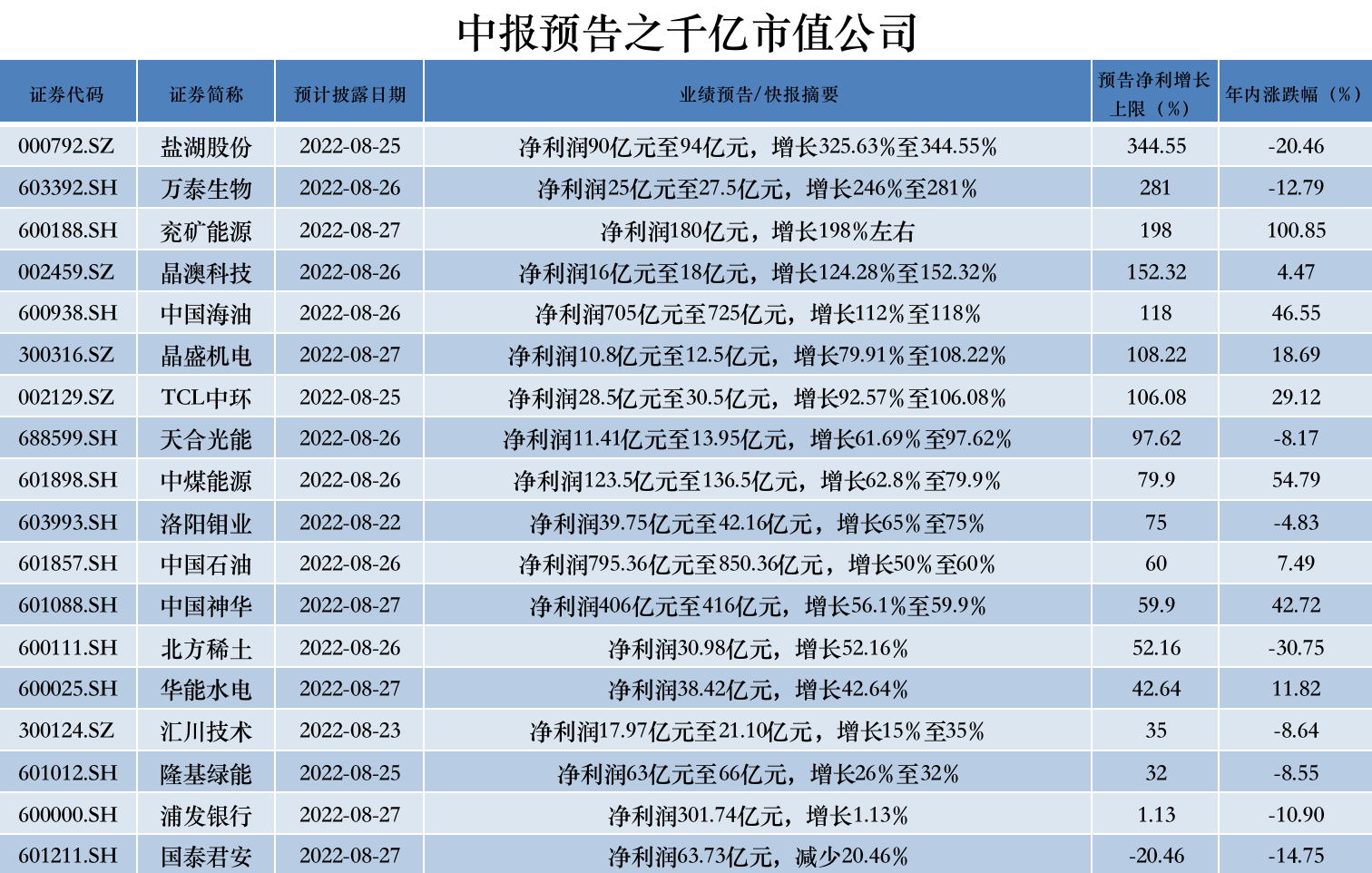 有色金属板块业绩也较为亮眼。合盛硅业(603260.SH)、洛阳钼业(603993.SH)、北方稀土(600111.SH)将披露中报。洛阳钼业预计上半年净利润39.75亿元至42.16亿元、北方稀土净利润约30.98亿元,2家公司预告净利润增长幅度均超过50%。不过股价表现却不如人意。按8月19日收盘价计算,洛阳钼业年内股价累计下滑4.82%、北方稀土年内股价累计下跌30.75%。