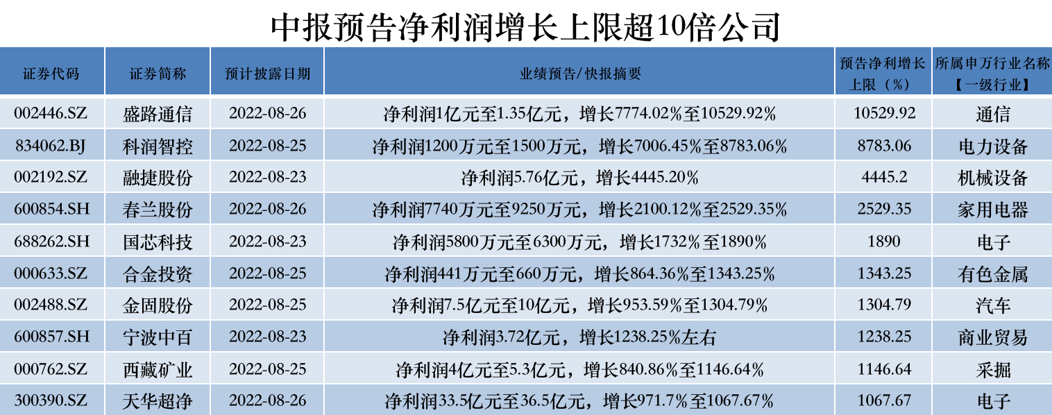 本周有至少10家公司预计2022年上半年业绩最高增长10倍以上,分别为盛路通信(002446.SZ)、科润智控(834062.BJ)、融捷股份(002192.SZ)、春兰股份(600854.SH)、国芯科技(688262.SH)、合金投资(000633.SZ)、金固股份(002488.SZ)、宁波中百(600857.SH)、西藏矿业(000762.SZ)、天华超净(300390.SZ)。