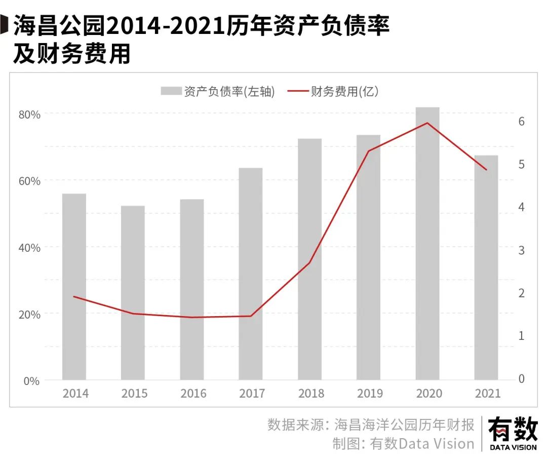 为了养更多的海洋生物开出更多的游乐园,海昌不得不大规模举债,甚至还在自己的乐园内建设了一系列繁殖养育中心。2017年郑州开始建设乐园,2018年上海海洋公园开业,2019年三亚不夜城开业,高速扩张的前提下,海昌的债务也在狂飙。