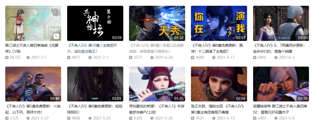 另外,由于IP原著《画江湖之不良人 第四季》并不在B站渠道的缘故,项目组则发布视频预告的方式,吸引B站IP粉丝的关注。可是动漫TV“内容预告”播放量并不高,仅有少量视频超过万次播放。
