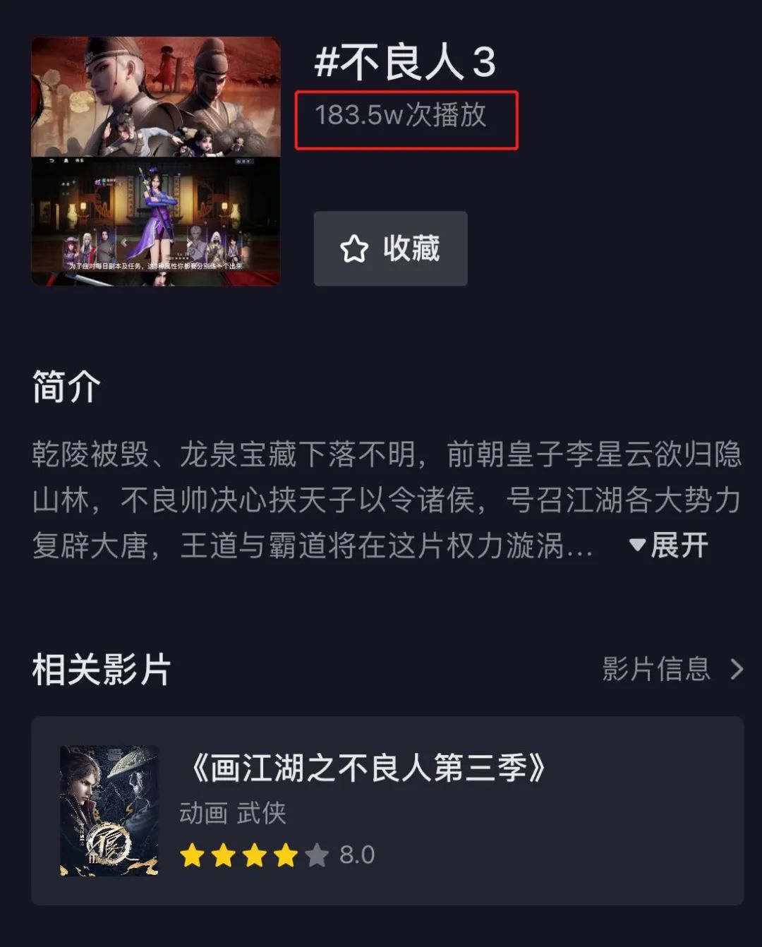 从数据方面来看,官方抖音账号目前不超过8000粉丝,而且内容整体单调,似乎没有在短视频平台渠道上投入太多。相关话题#不良人3#总播放量仅有183.5W次。