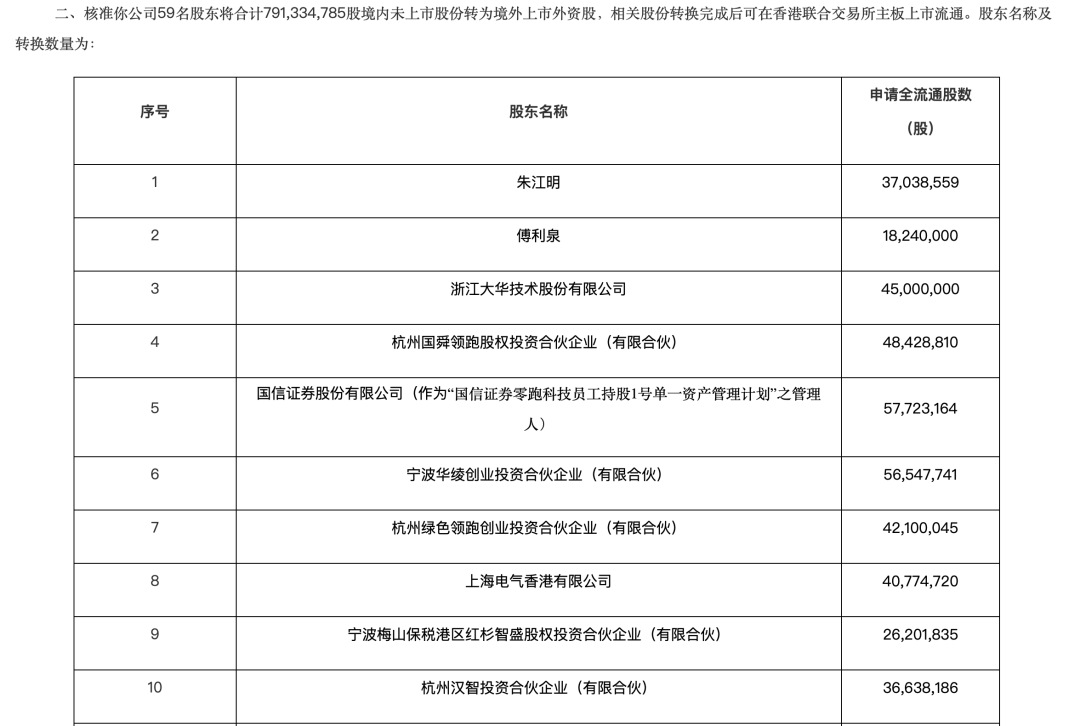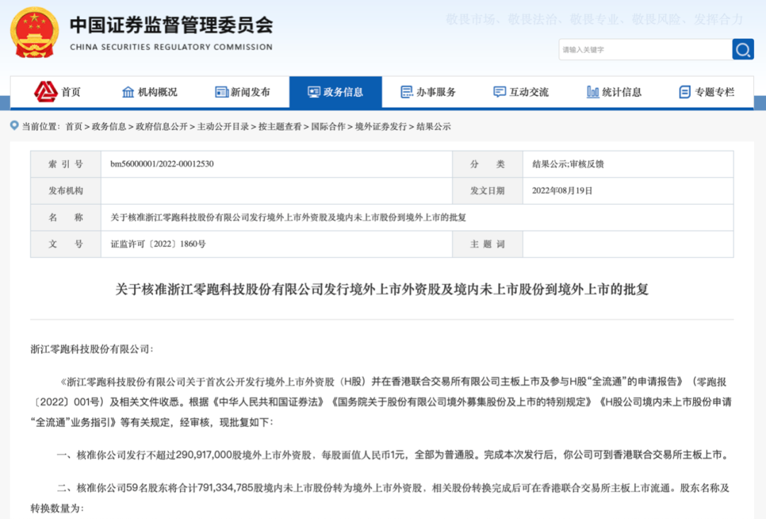 证监会官网于8月17日披露的文件显示,已核准零跑发行不超过2.9亿股境外上市外资股,每股面值人民币1元,全部为普通股。完成本次发行后,零跑可到香港联合交易所主板上市。核准零跑59名股东将合计7.9亿股境内未上市股份转为境外上市外资股,相关股份转换完成后可在香港联合交易所主板上市流通。